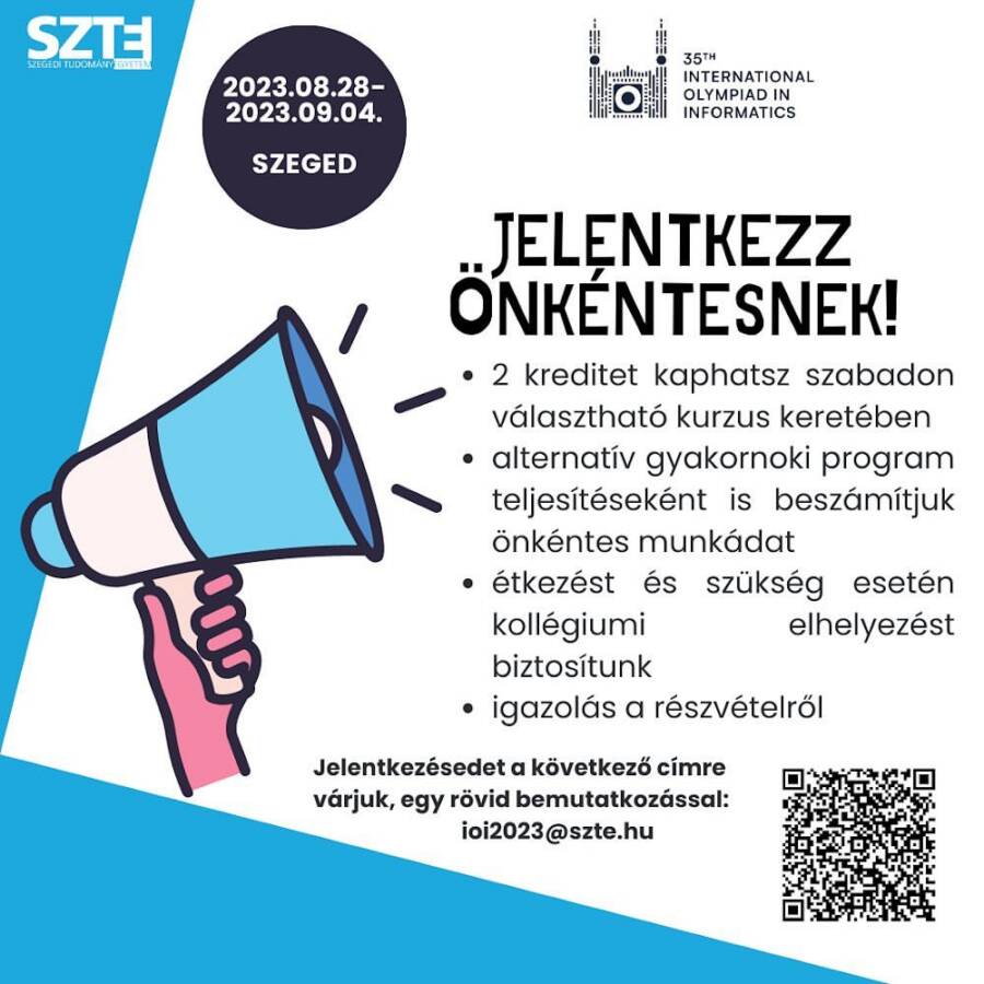 #SZTE Jelentkezz te is önkéntesnek! Idén az SZTE közreműködésével kerül megrendezésre a Nemzetközi Informatikai Diákolimpia, ahova lelkes önkénteseket keresnek. Ezt ne hagyd ki te se! 😉